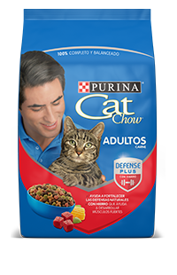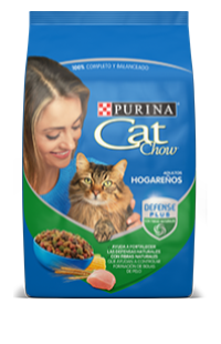 El nuevo PURINA® CAT CHOW® HOGAREÑOS CON DEFENSE PLUS ofrece los nutrientes que tu gato necesita para mantenerse saludable. Contiene fibras de soya y celulosa, que ayudan a controlar la formación de bolas de pelo.