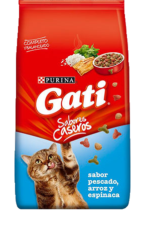 El nuevo GATI SABORES CASEROS PESCADO, ARROZ Y ESPINACA ofrece los nutrientes que tu gato necesita para mantenerse fuerte y saludable. Su fórmula contiene entre sus ingredientes proteínas de la carne, naturalmente ricas en hierro, que lo ayudan a desarrollar músculos fuertes